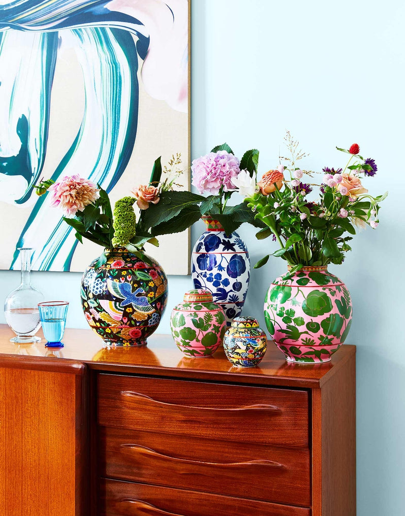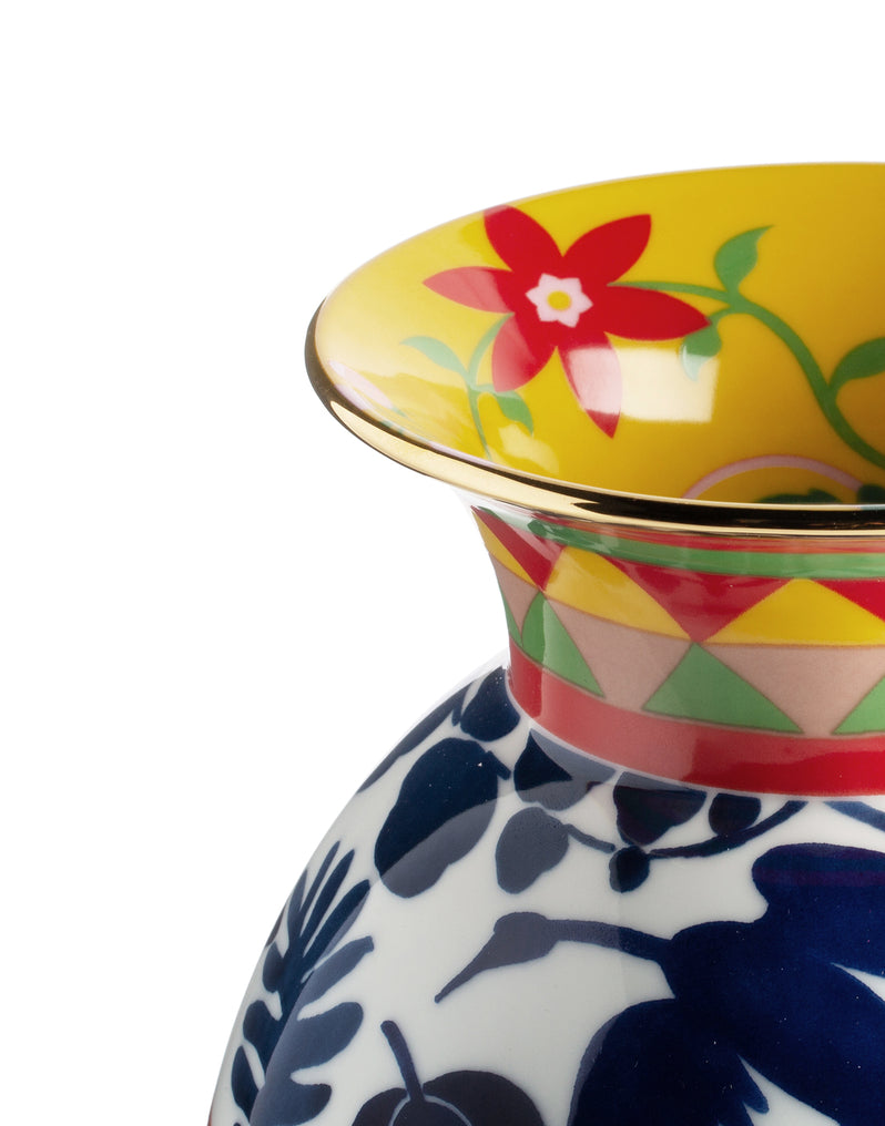 Historic Verona-based porcelain maker Ancap were the masters behind this exquisitely printed porcelain vase, which features 18K gold trim, contrast decorative lining and supersaturated colors. The vintage pattern was cut into strips and placed in three different segments so that it could completely cover the round porcelain base and still look totally fabulous. The contrast-colored belly band and gold trim were hand-painted by the most kick ass artisan hands. Contrasting motifs were also designed inside the mouth of the vase's vessel.