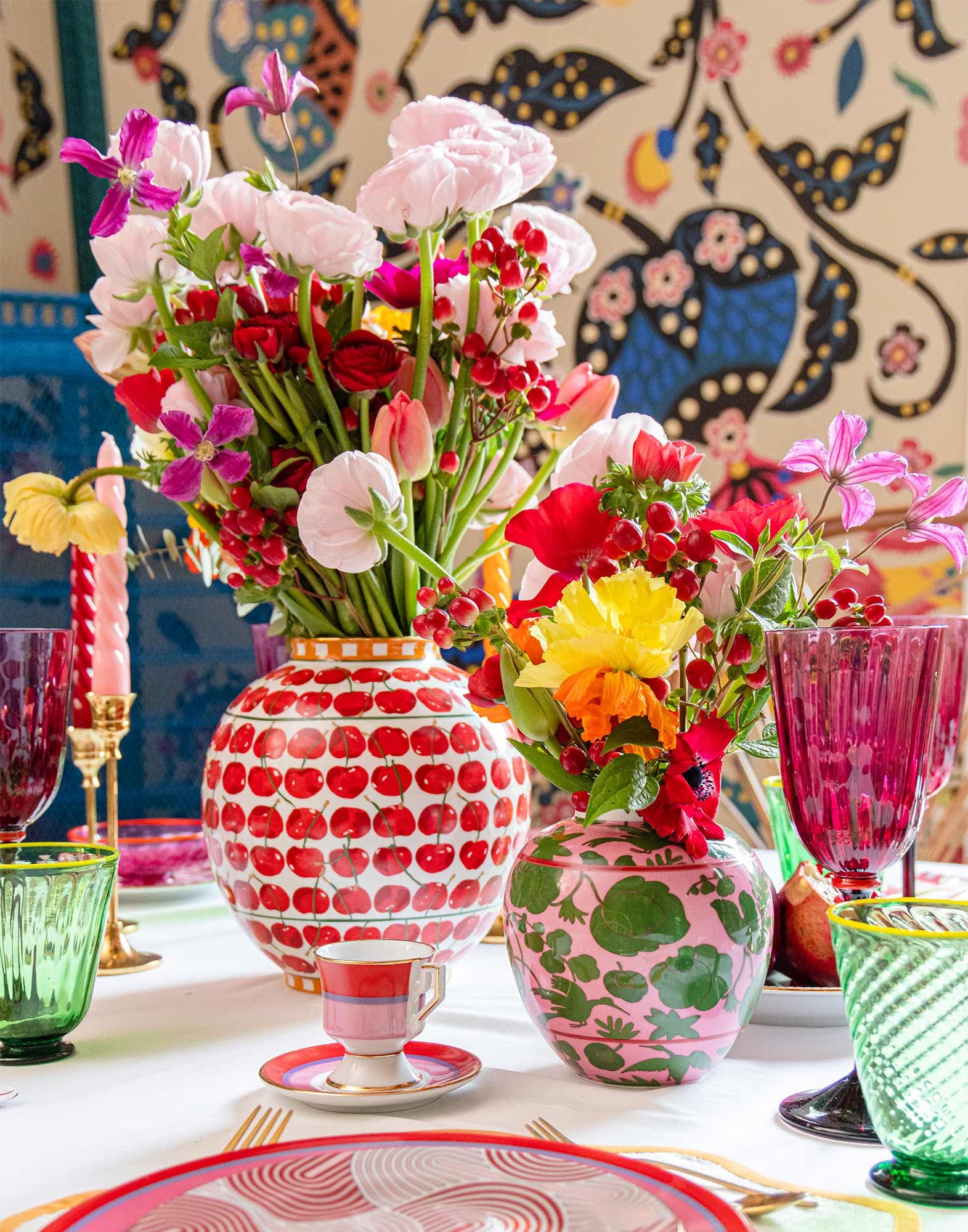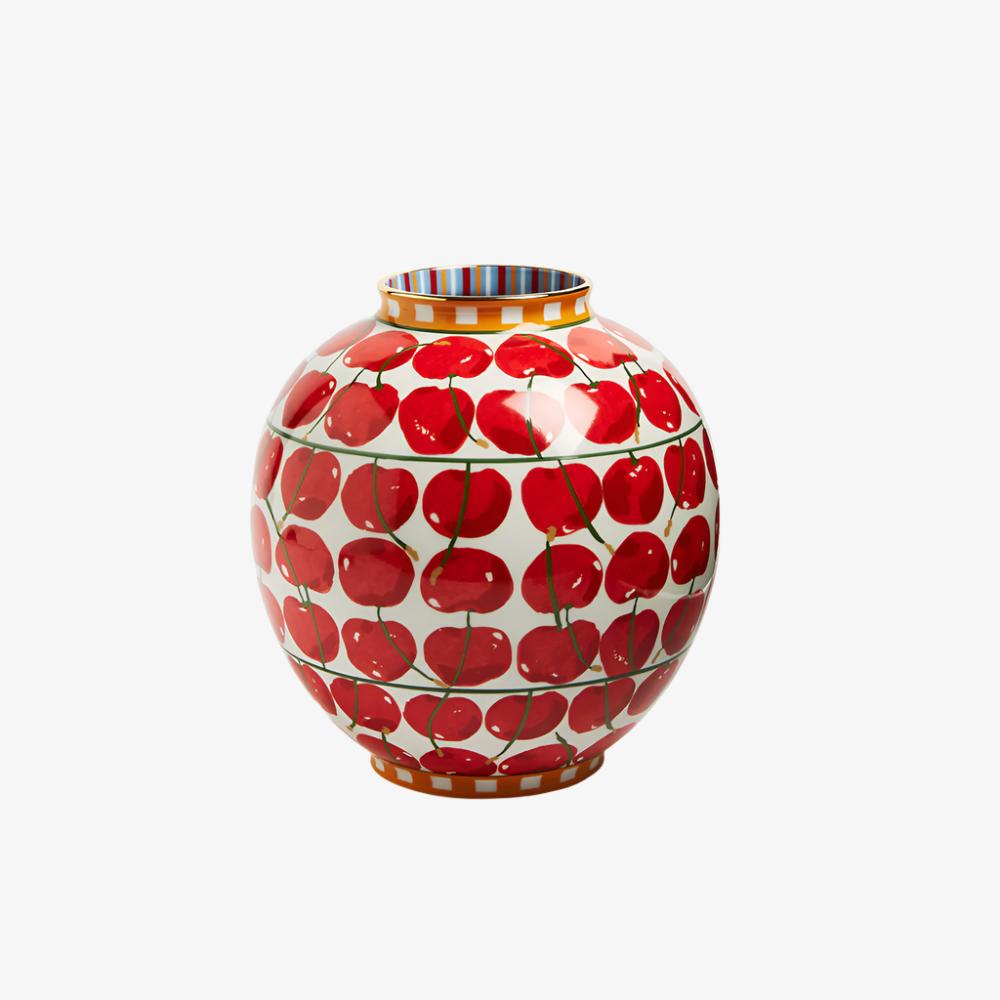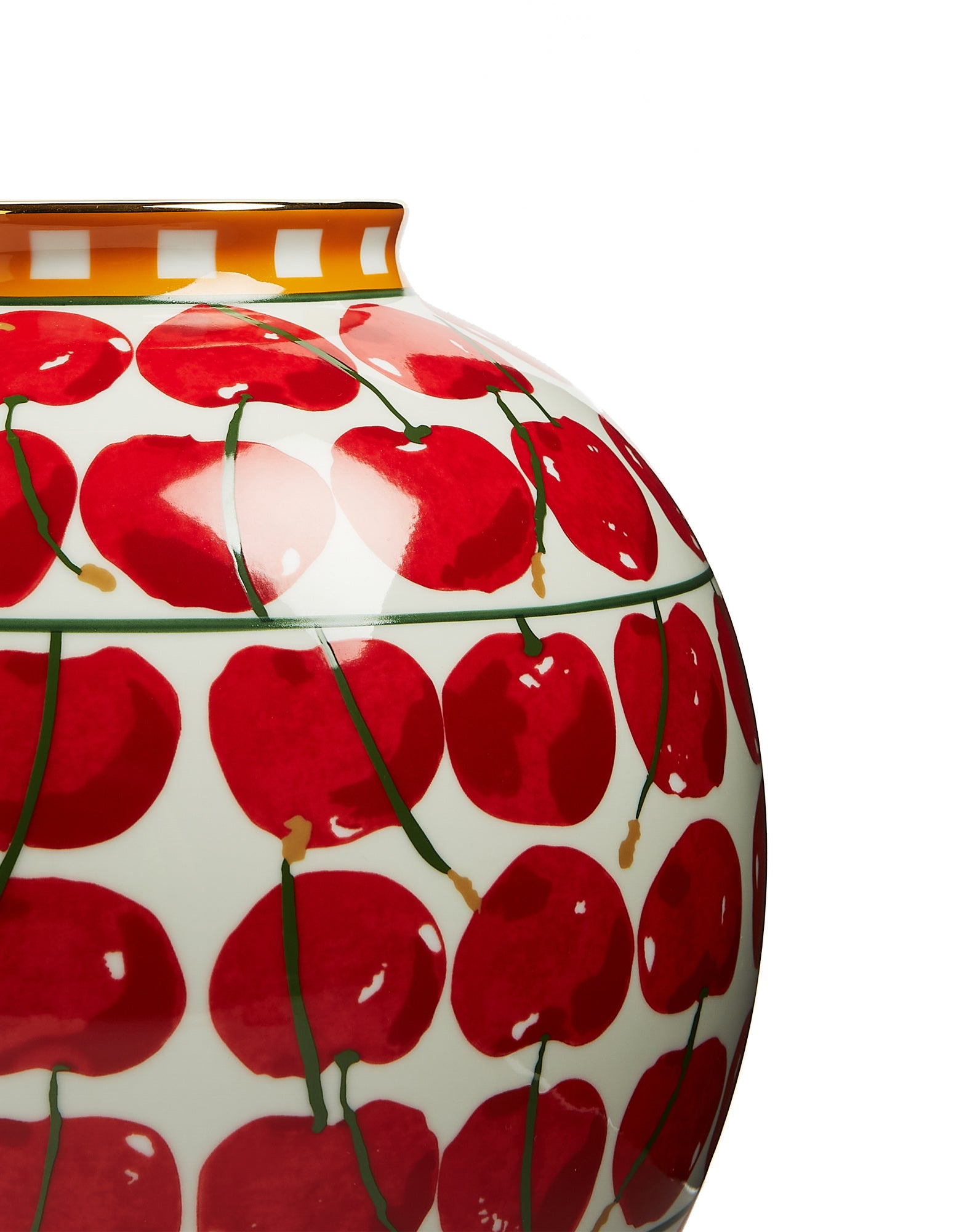La DoubleJ's Bubble Vase - Cherries Avorio in Porcelain is a vibrant and whimsical statement piece, featuring a round, bulbous shape adorned with a charming cherry motif in rich red hues against an ivory background. The vase is elegantly finished with a multicolored striped rim and a contrasting orange and white checkered base, creating a playful yet sophisticated accent for any luxury interior.