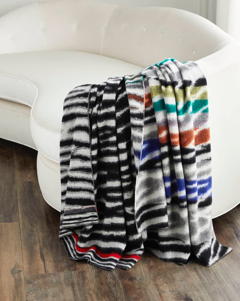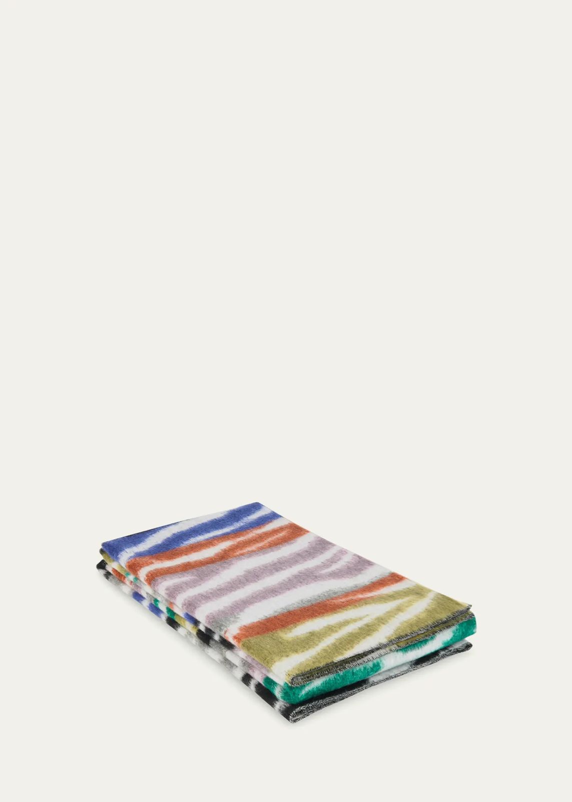 Giving the bedroom a hint of wild and, at the same time, refined exoticism is possible with the 130x190 cm plaid blanket in pure wool. Featuring an animal pattern made with MissoniHome's fine jacquard work, this blanket has contrasting details and fringed edges, adding a distinctive and charming touch to the room.