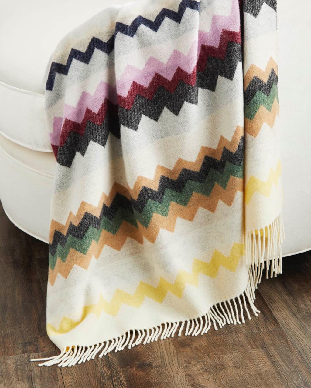 The Clifford Blanket is one of a kind and follows a precise aesthetic with its zigzag pattern and fringed edges. It has the special warmth of a blend of textiles and Missoni's iconicity.