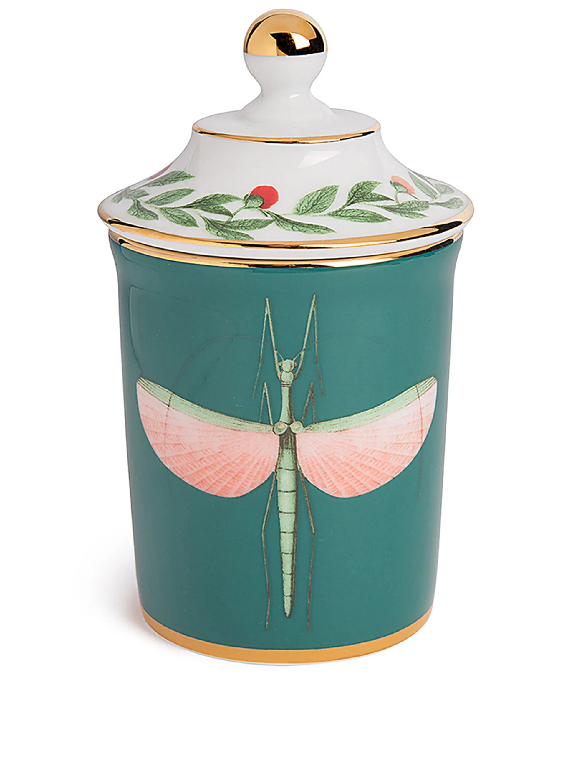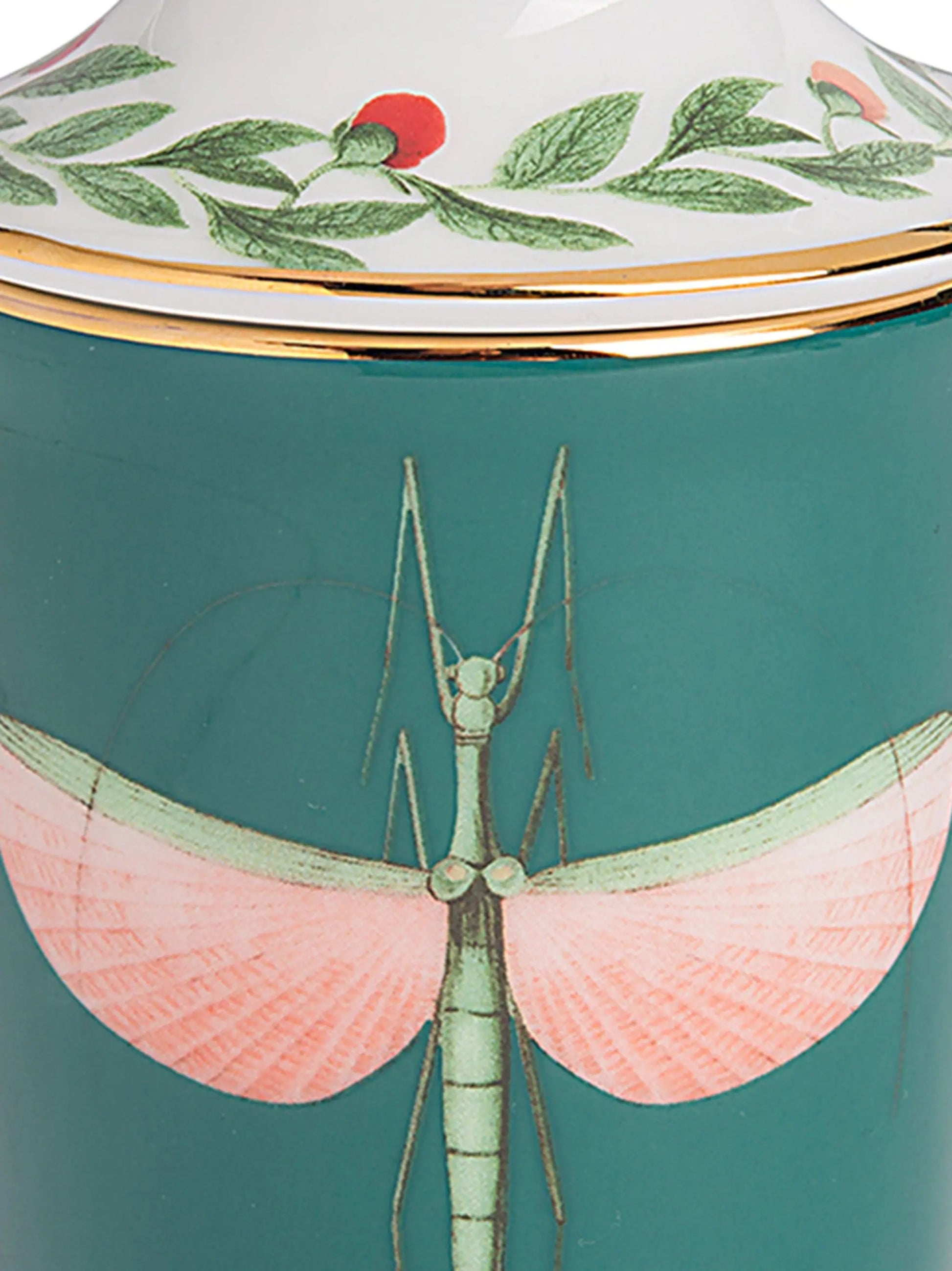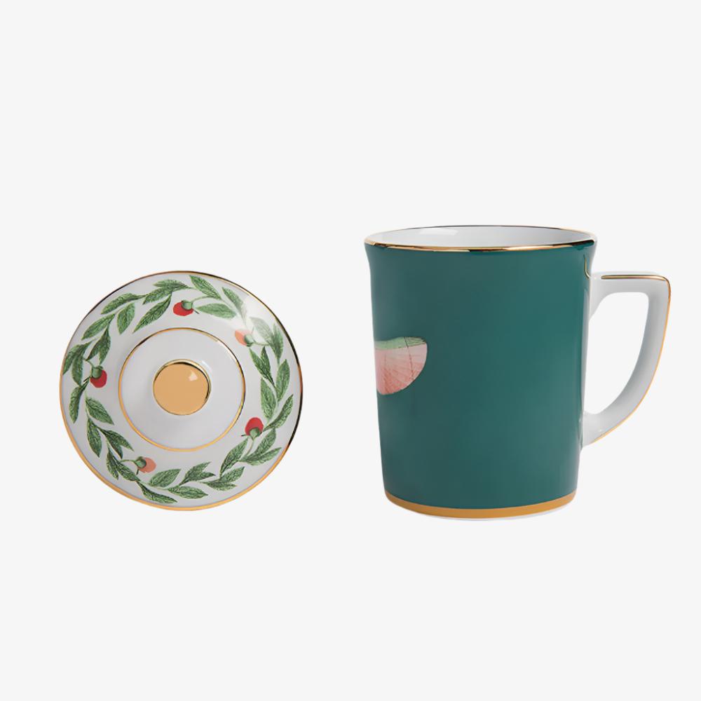 This exquisite hand-painted lidded mug by La DoubleJ features a striking teal body adorned with a delicate dragonfly motif in soft pink and green, complemented by a white lid embellished with a nature-inspired leaf and berry design. The piece is elegantly finished with gold trim, adding a touch of luxury to its whimsical and botanical-inspired aesthetic.