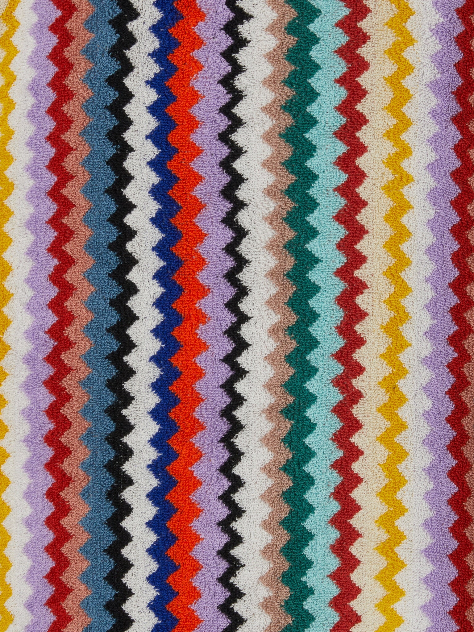 The Riverbero bathrobe embodies the distinctive elegance and comfort of MissoniHome. Made of soft cotton terry, it features the inimitable zigzag pattern that catches the eye and adds a touch of liveliness to everyday life. Complete with waist belt, hood and patch pockets, the model offers not only practicality, but also an iconic style that conveys the brand's unique essence.