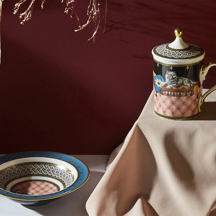 This exclusive porcelain mug with lid from the Totem Collection is a contemporary take-on porcelain cups from the 18th century, which were adorned with decorations of symbolic animals. Dedicated to the cat - species associated with independence and intelligence - the subject is here enhanced with vivid enamels inspired by nature and a golden handle and spherical finial for the lid.