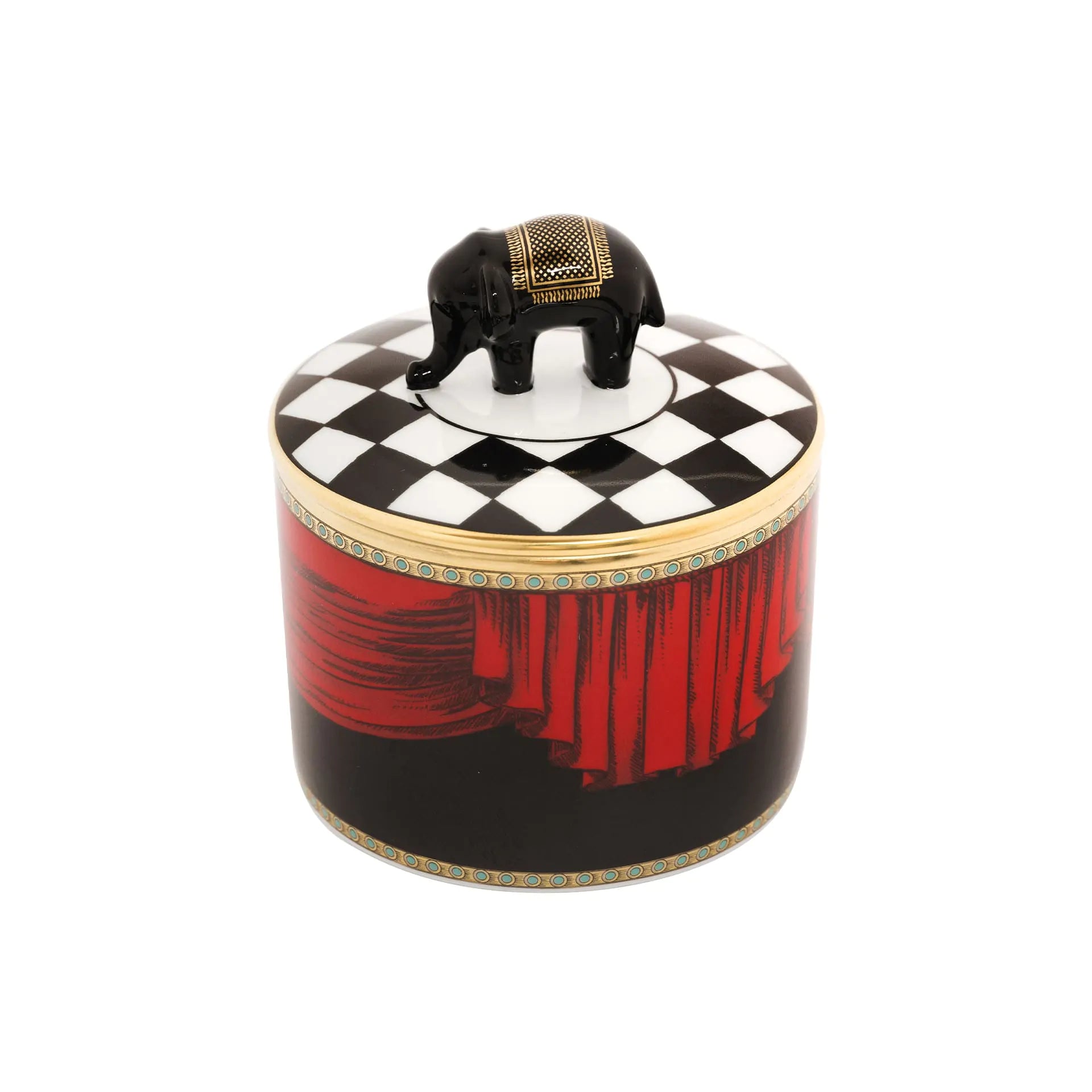 Part of the Totem Collection, this box with lid is crafted of porcelain and decorated with abstract patterns in black and white that adorn the lid. The handle of the lid is a miniature sculpture shaped like an elephant, symbol of ancient wisdom and memory.