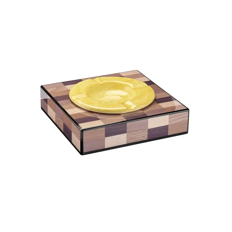 Materials: Wood, inlaid veener, handpainted ceramic.